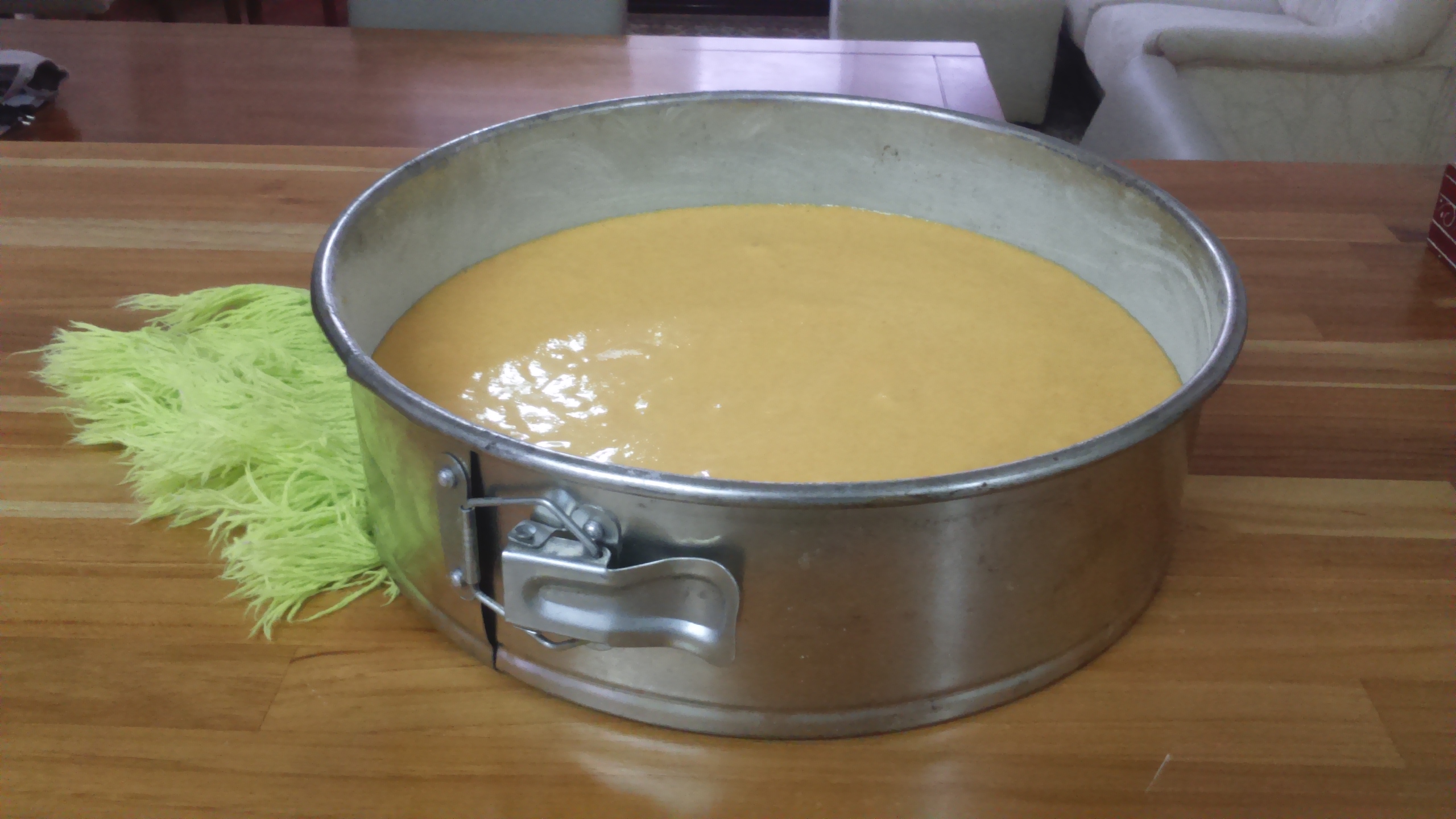 6. Transfira a massa para a assadeira e leve ao forno preaquecido por cerca de 50 minutos. Para saber se o bolo está bom, espete um palito na massa: se sair limpo é sinal de que o bolo está assado e pode ser retirado do forno. Caso contrário, deixe por mais alguns minutos até que asse completamente. Deixe esfriar por 15 minutos antes de desenformar.